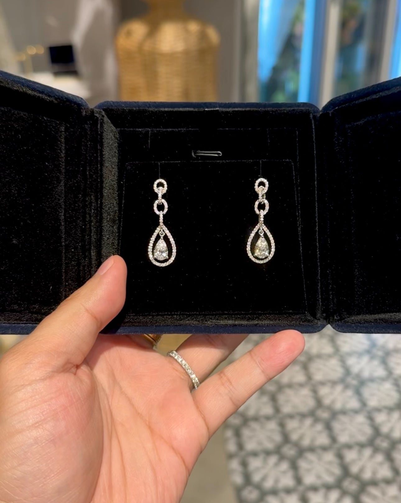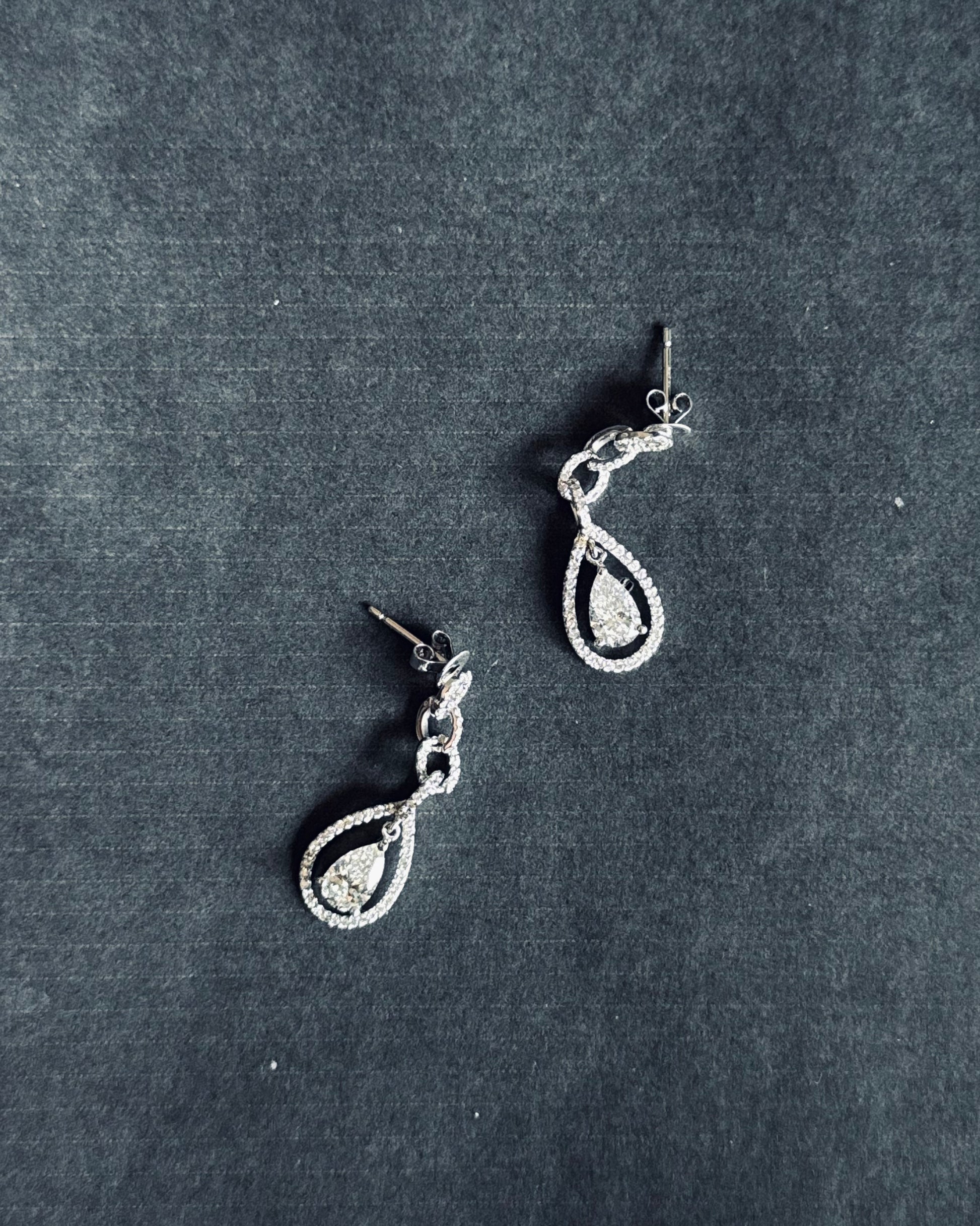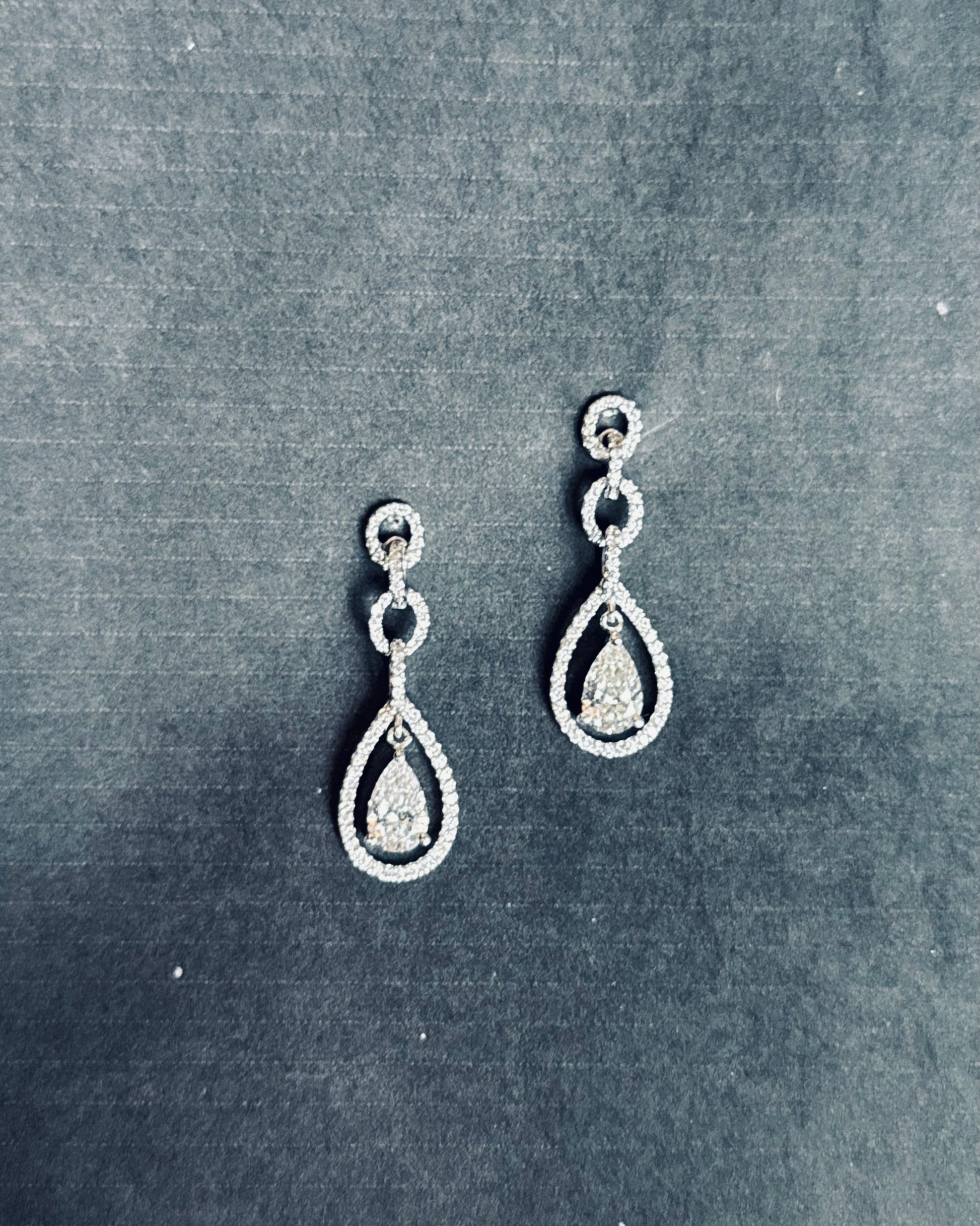 18K Solid White Gold, entirely handmade, natural diamond borders with 1 carat pear-shaped diamonds.