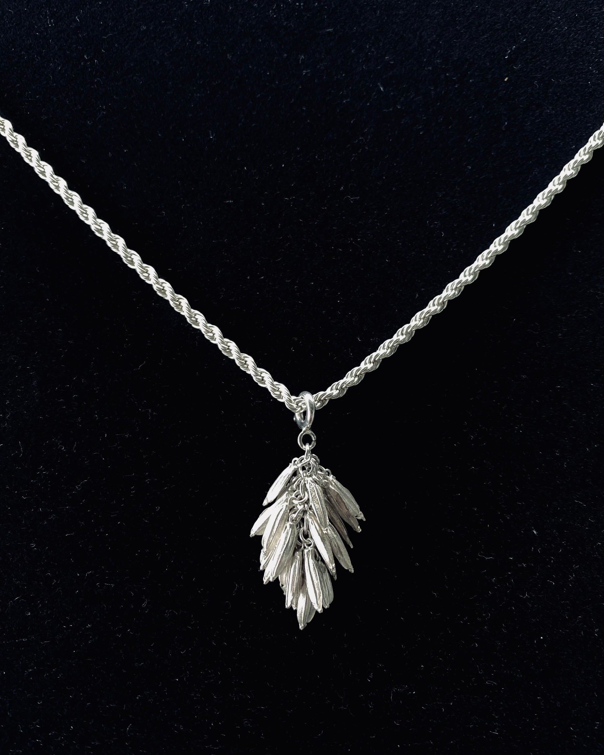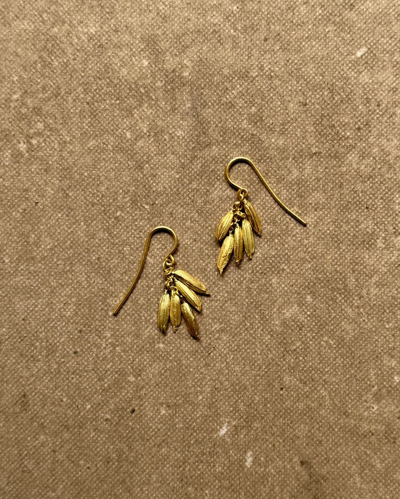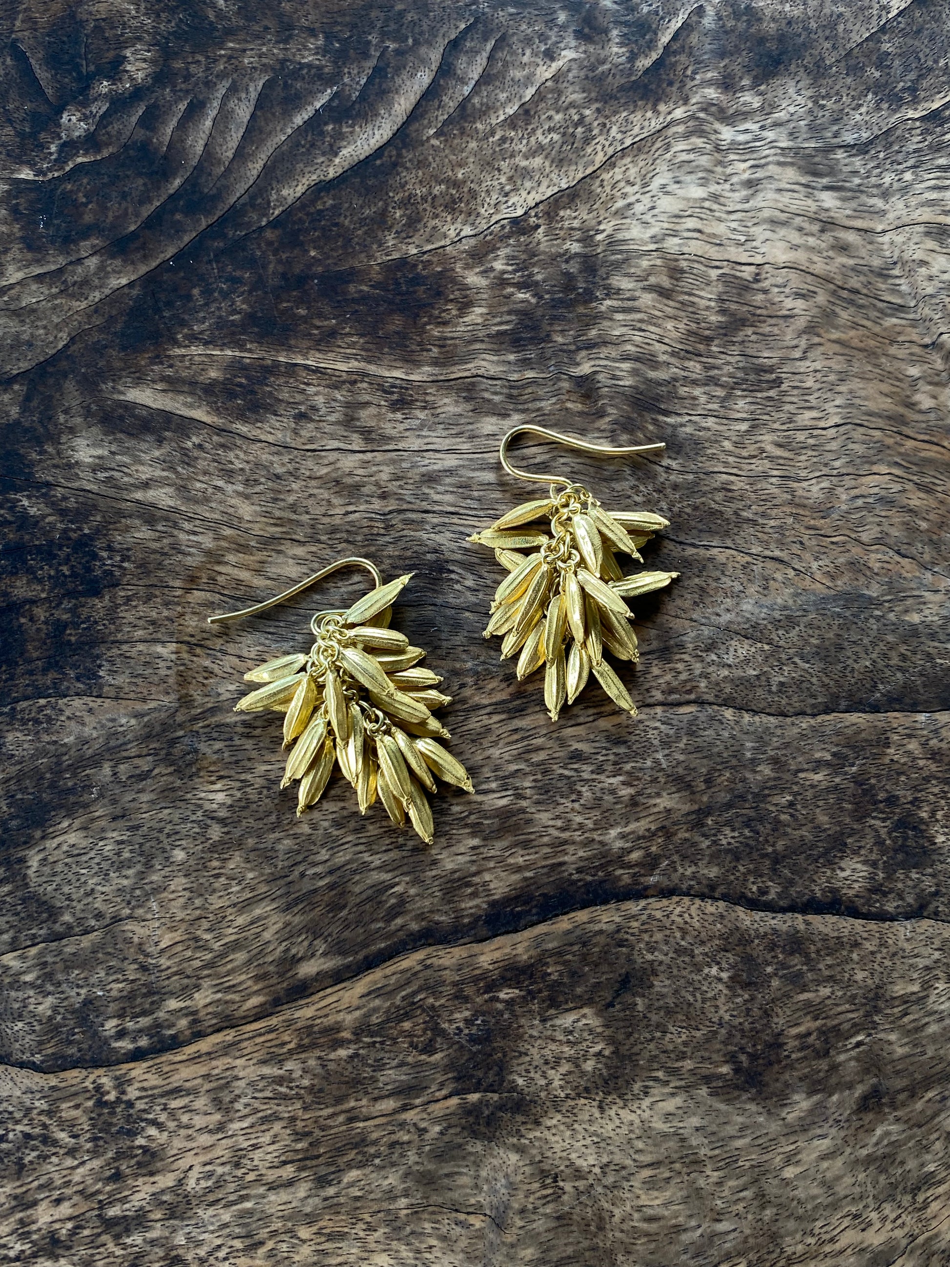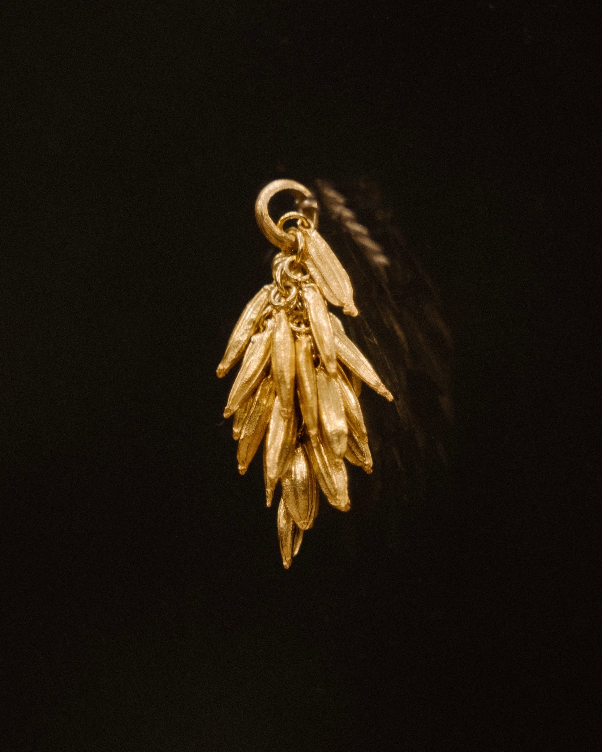 The 28 delicate grains in 18K gold, varying in shape and form with striations akin to real rice, are engineered by Oslog to form a singular hull when hung as a pendant or earrings.