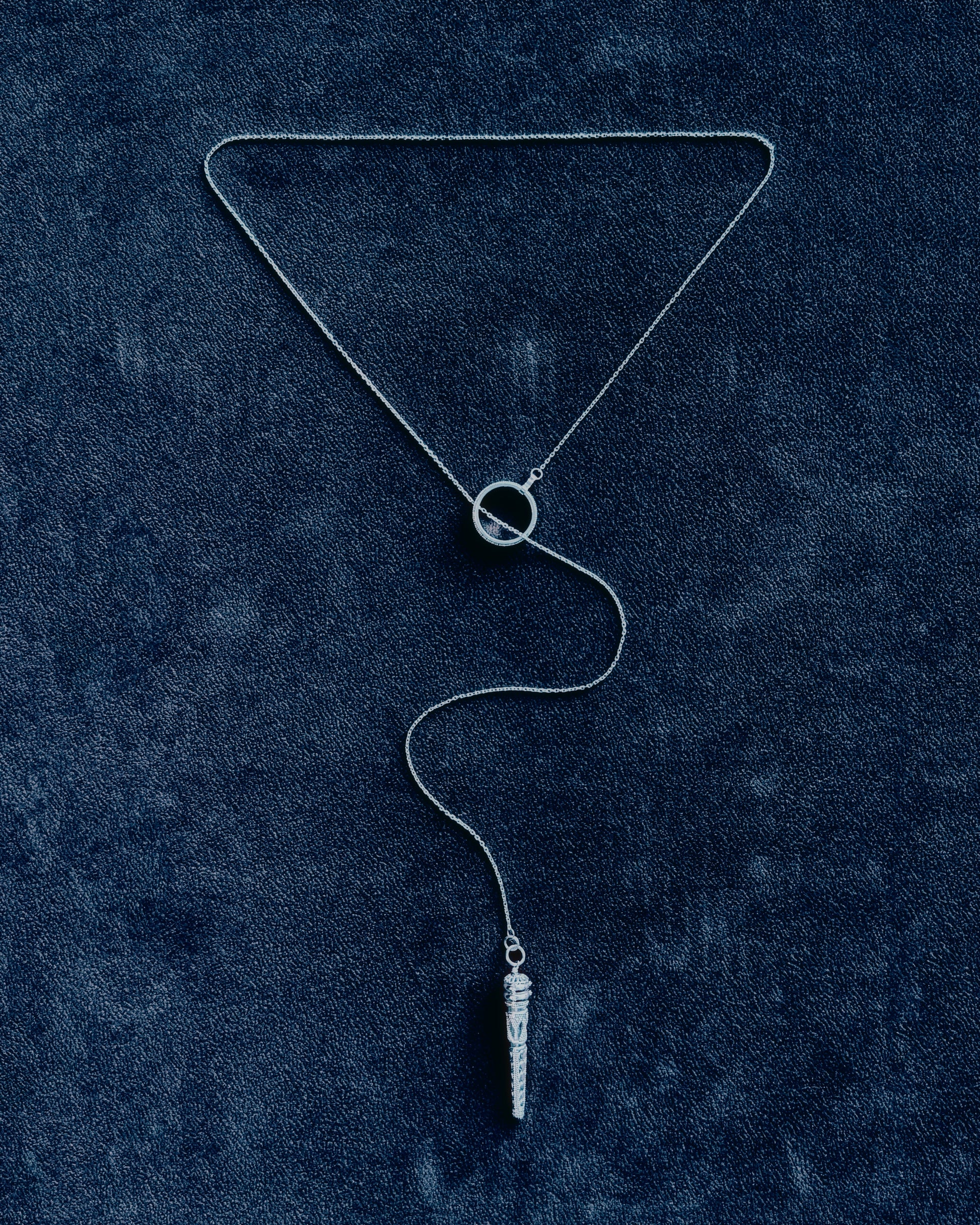 The Neo Wayfinder Lariat is built around a central ring that functions as pivot and anchor. From it, a silver chain extends downward, ending in a pointed terminal that stabilizes the line.