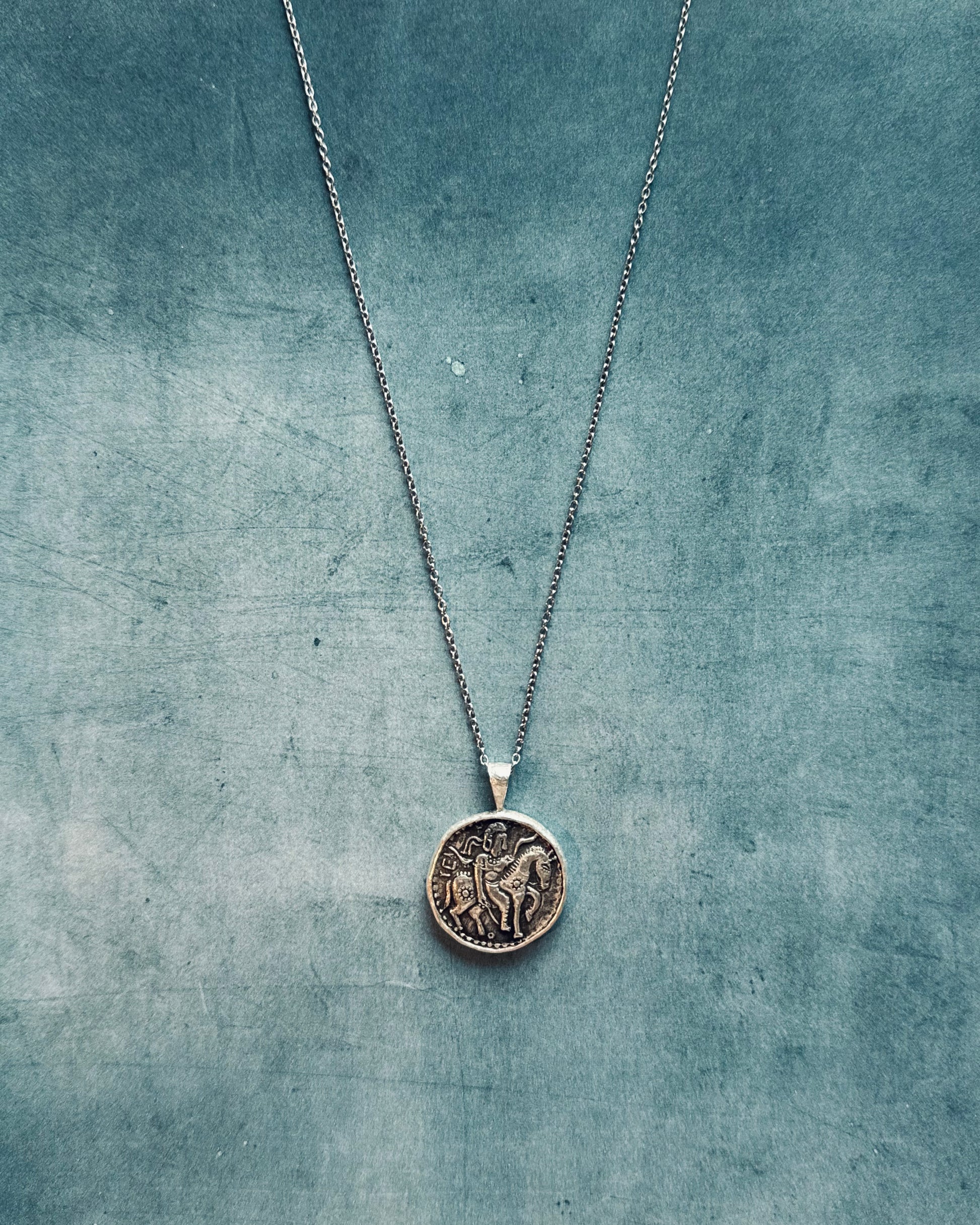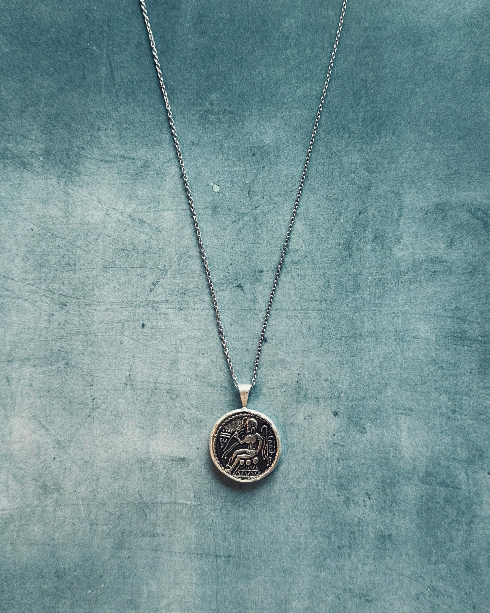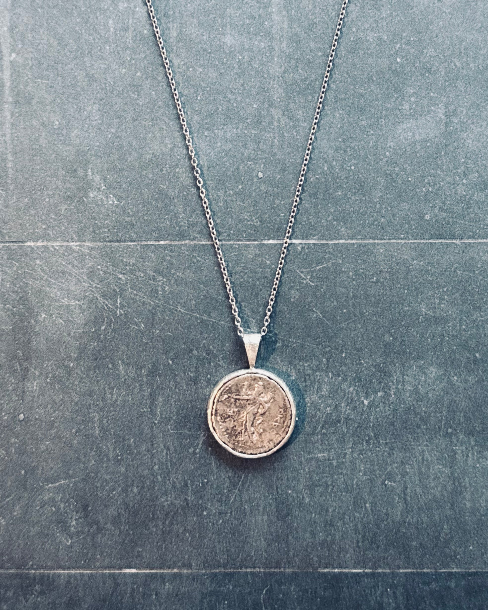A reproduced silver coin, encased in handcrafted sterling silver.