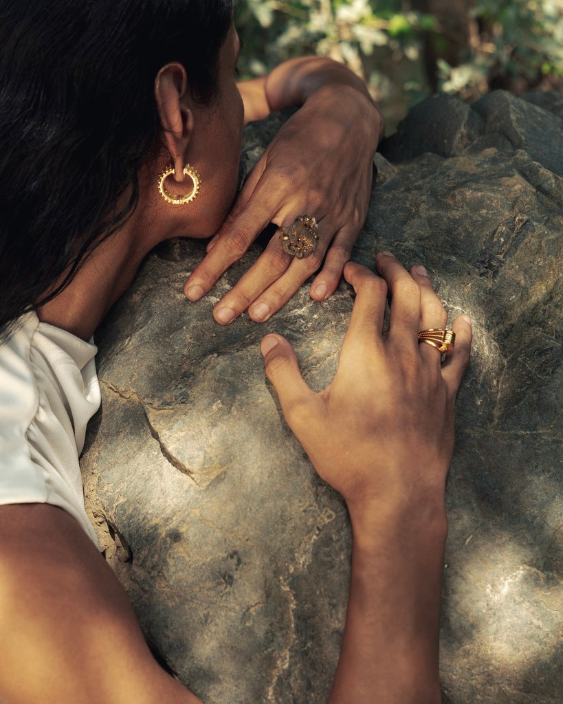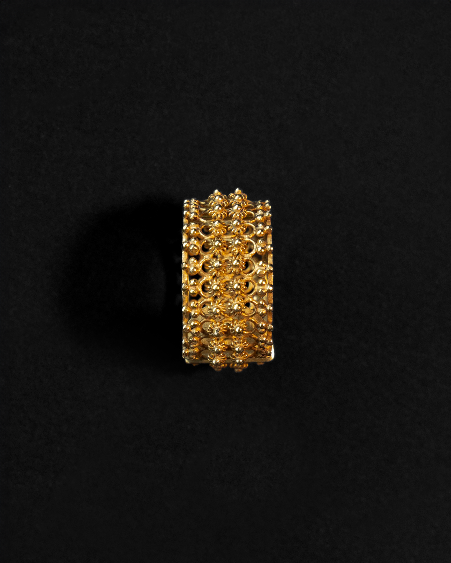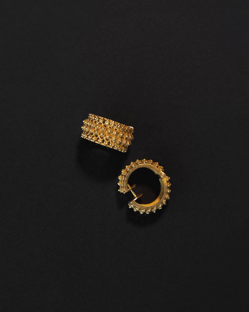Patterned in the sun's scintillating rays, these hoop earrings play with the interplay of light and shadow. Each small sphere is delicately formed, coiled, and soldered by skilled artisans, made to glisten in every important moment in your life.