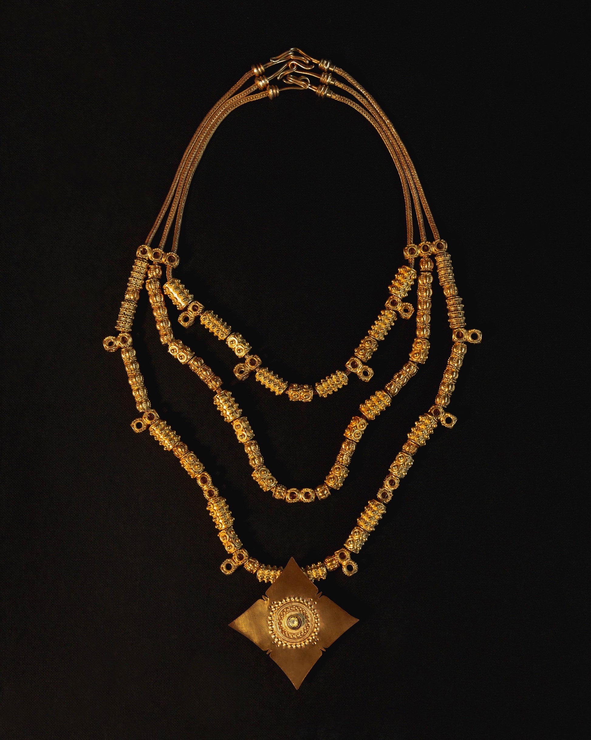 A reproduction piece by master artisan Oslog in gold vermeil emerges: a three-strand beaded necklace fixed with a Sun Chief medallion, featuring an unheated yellow Sri Lankan sapphire at the center.